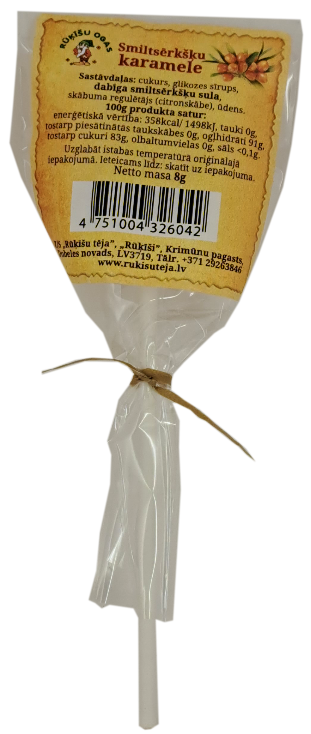 Sastāvdaļas: cukurs, glikozes sīrups, dabīga smiltsērkšķu sula, skābuma regulētājs (citronskābe), ūdens.